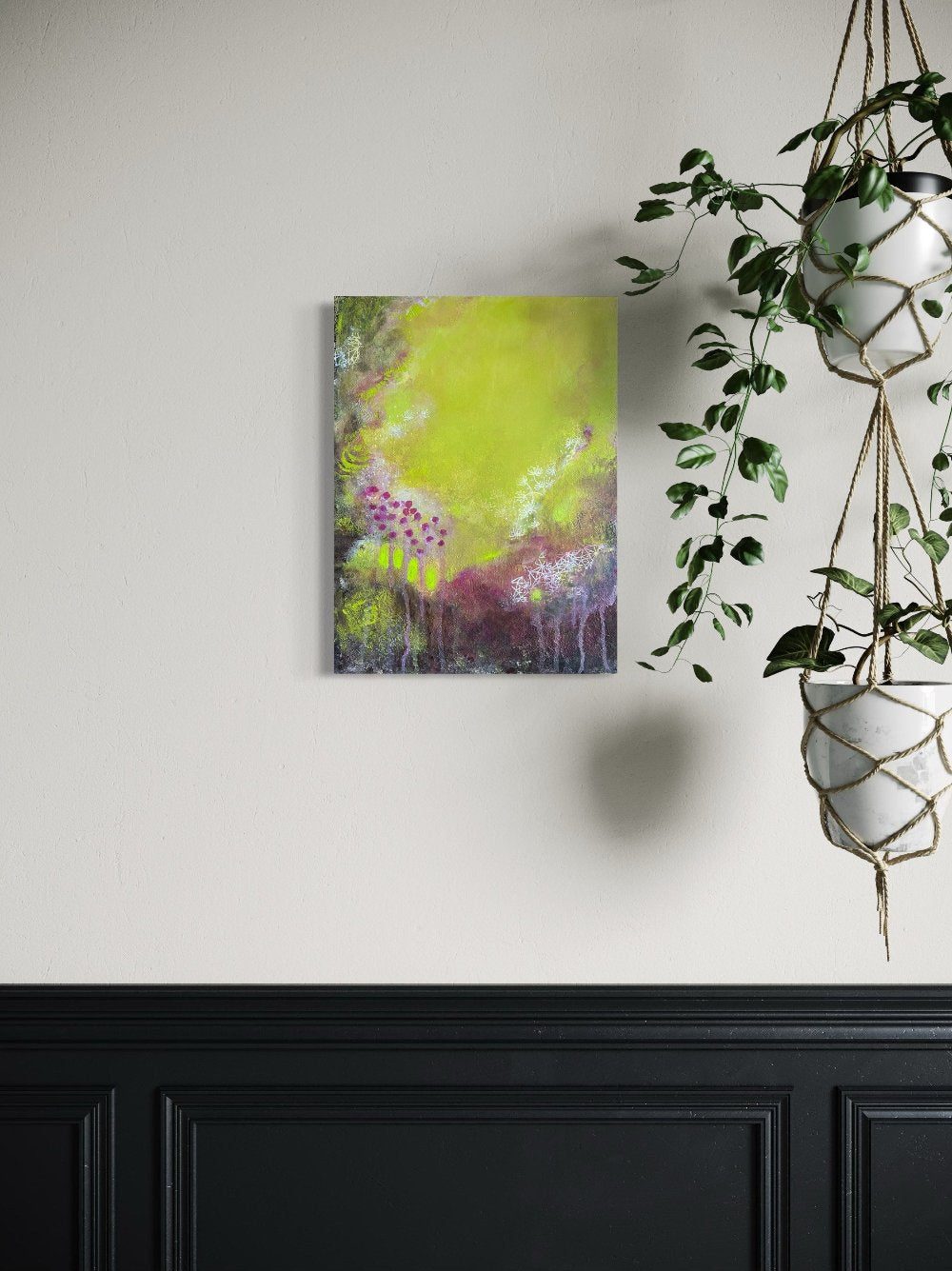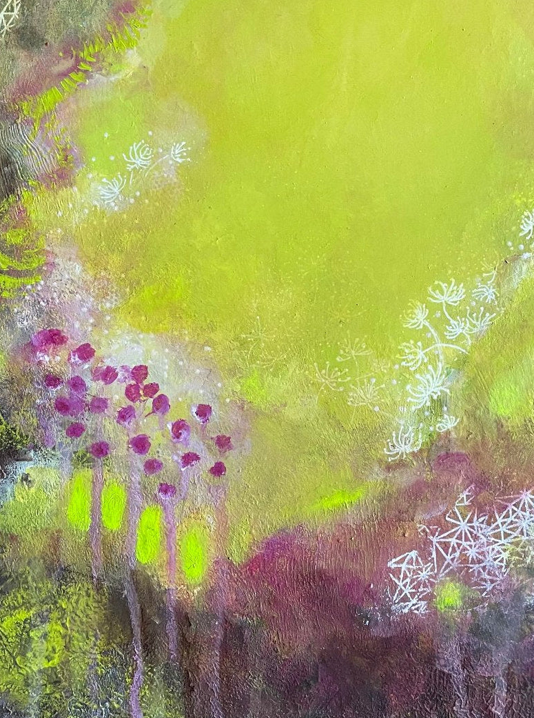 This painting is an invitation to experience the playful yet serene energy of nature, and to find joy in the harmonious interplay of colors and forms. By blending red and earthy tones with the dominant greens and pinks, I sought to create a sense of depth and complexity, reflecting the intricate beauty of a thriving garden. The lush greens symbolize growth and renewal, while the bright pinks represent the joy and vibrancy found in nature's blossoms.