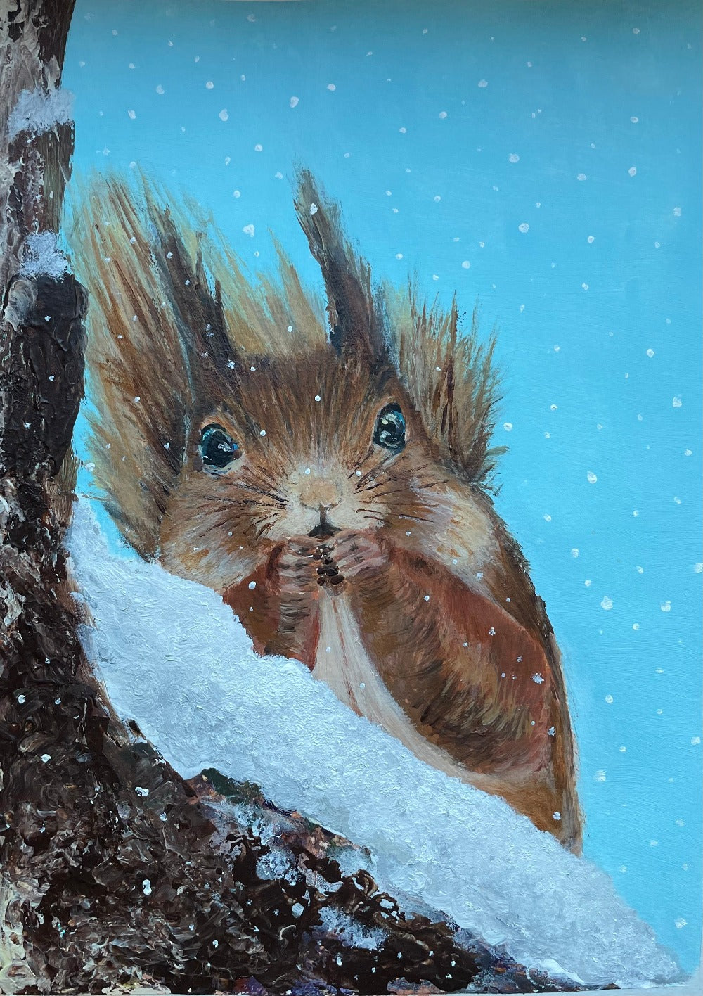 Discover the enchanting world of winter with this acrylic painting on paper, featuring a charming, soft, and cuddly squirrel partially hidden beneath a snow-covered tree. Immerse yourself in the serene, snowy atmosphere of this delightful artwork, bringing a touch of nature's beauty to your space.